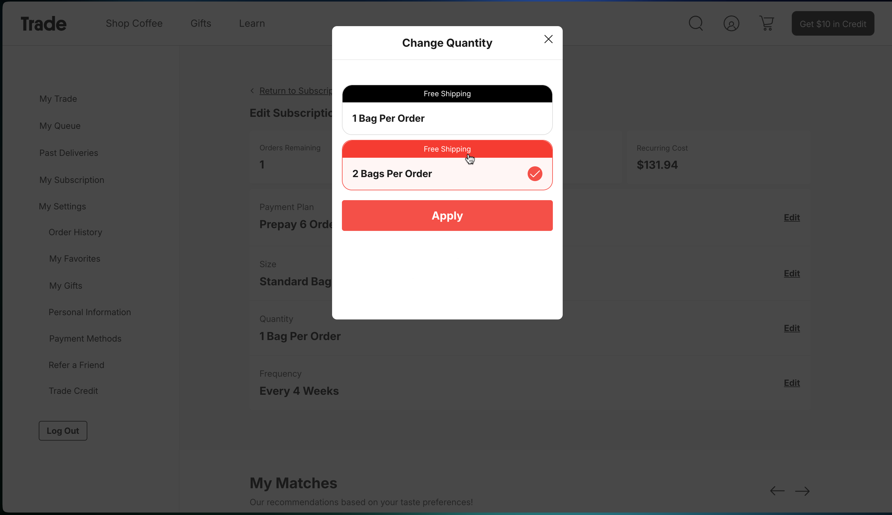 To have your subscription set up for two of the same bag per order, you can change your order quantity from your Subscription Details page.