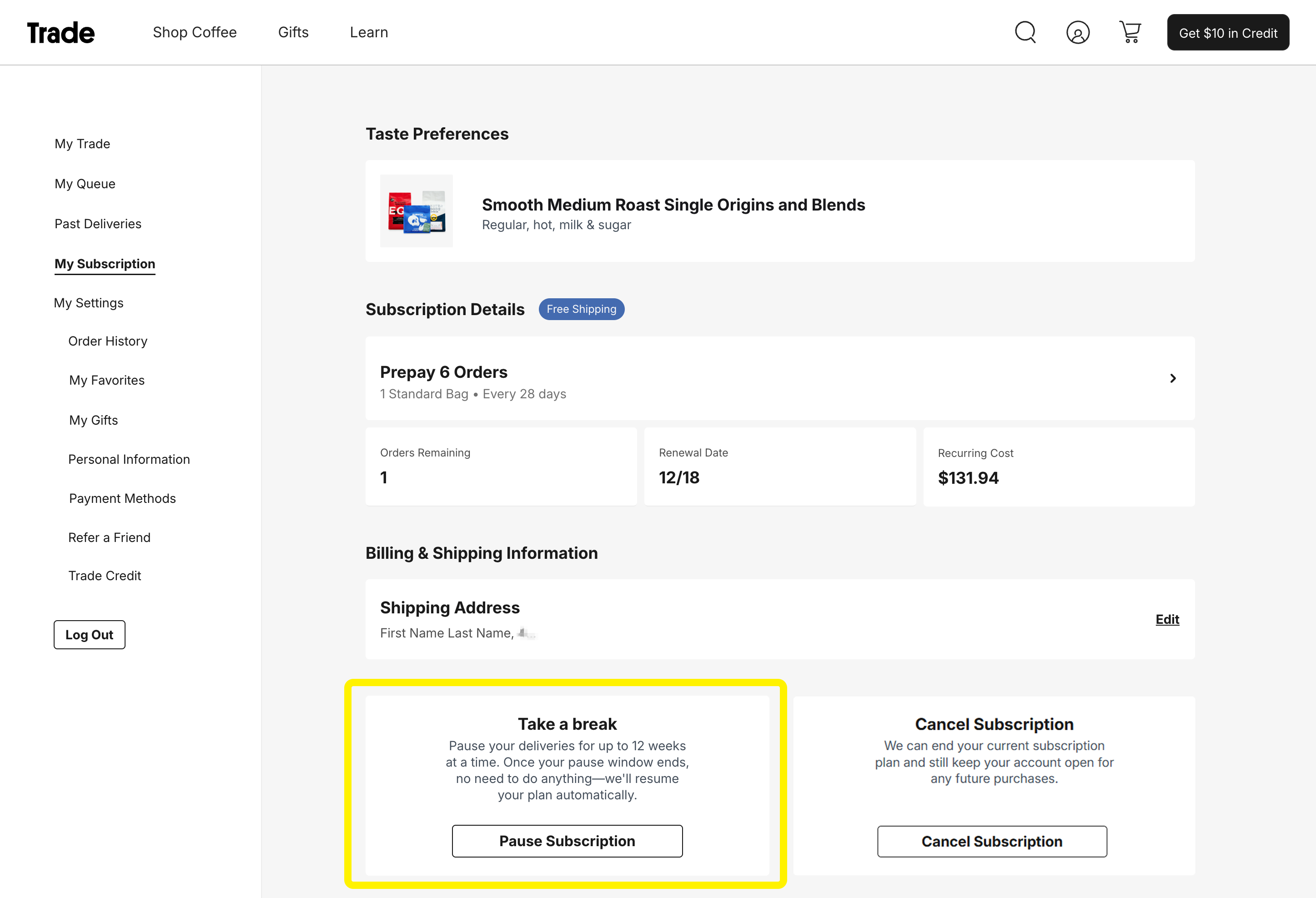 Yes! We totally understand needing to pause if you're going out of town or are backed up on coffee. Or any other reason! You can do this by navigating to your My Subscription page (make sure you're already logged in) and use the Pause Subscription button that's available right below the Billing and Shipping Information section.