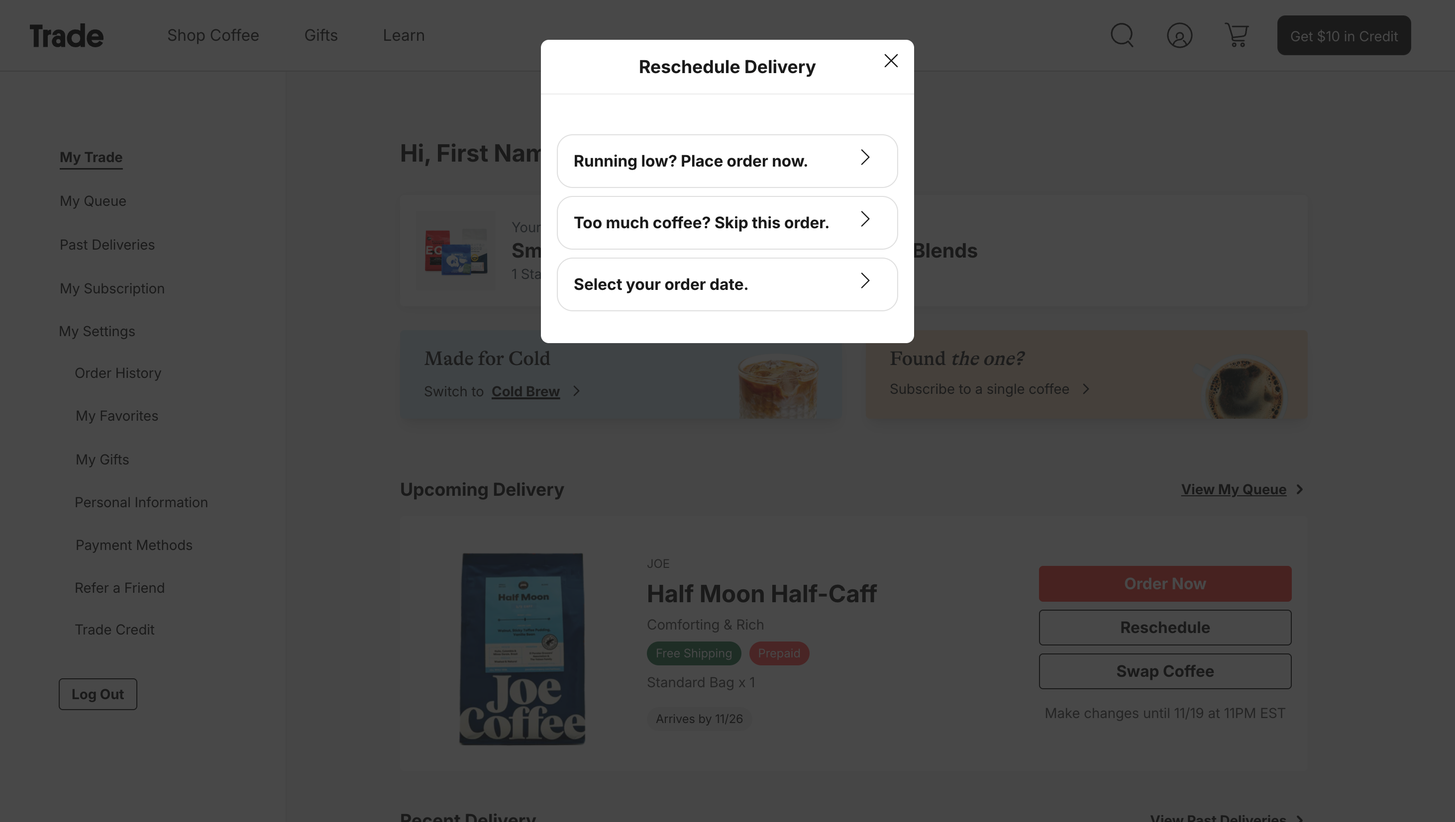 Going through coffee more quickly than anticipated? Need to take a short break? You can change the next order date on your subscription right from your Dashboard. Just make sure you're logged in!